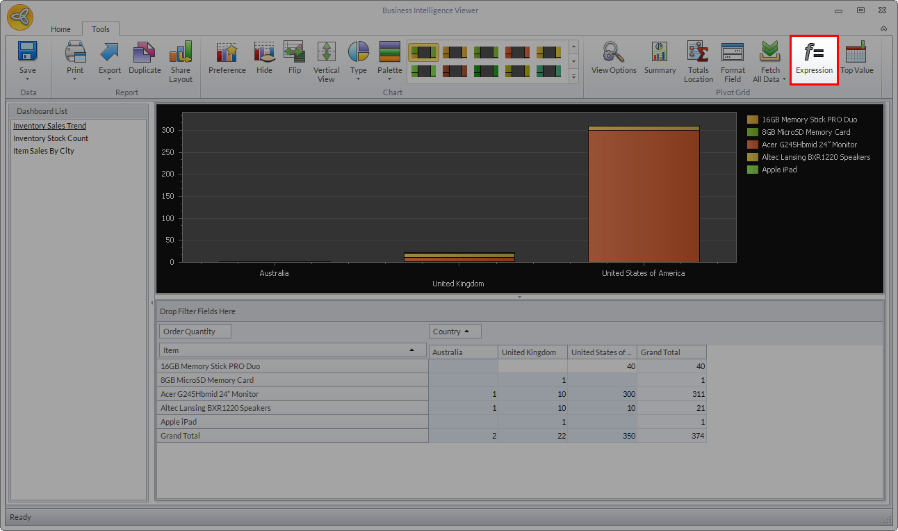 - In the Pivot Grid section, click on the Expression menu. The Unbound Expression form will be displayed.