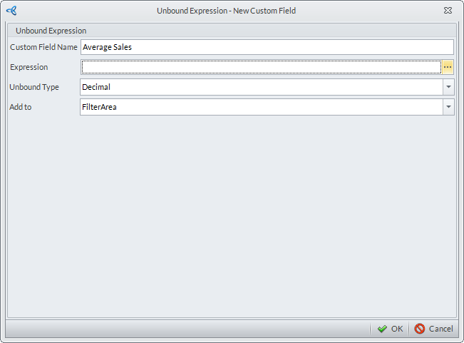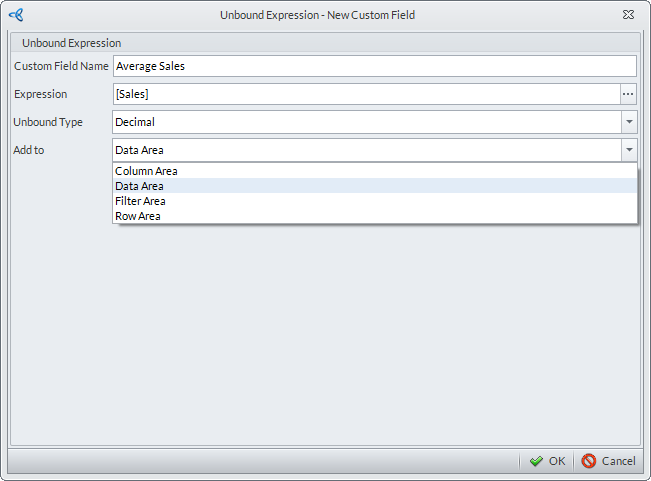- After setting the function for the custom field, specify the details for the Unbound Type (e.g. Decimal) and Add To fields (e.g. Data Area).Click OK.