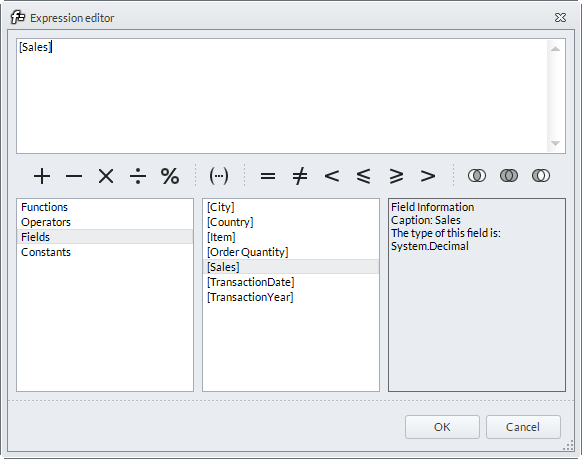 - Set the function for the new custom. Click on the ellipsis button in the Expression field and the Expression Editor will be displayed.