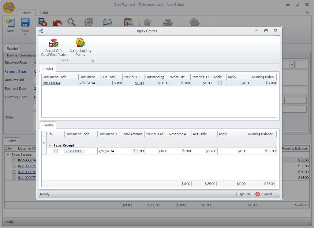 In Connected Business v14, aside from credits and customer receipts, you can also apply gift card/certificates or loyalty points against the invoice. See Apply Gift Card/Certificate As Credit.