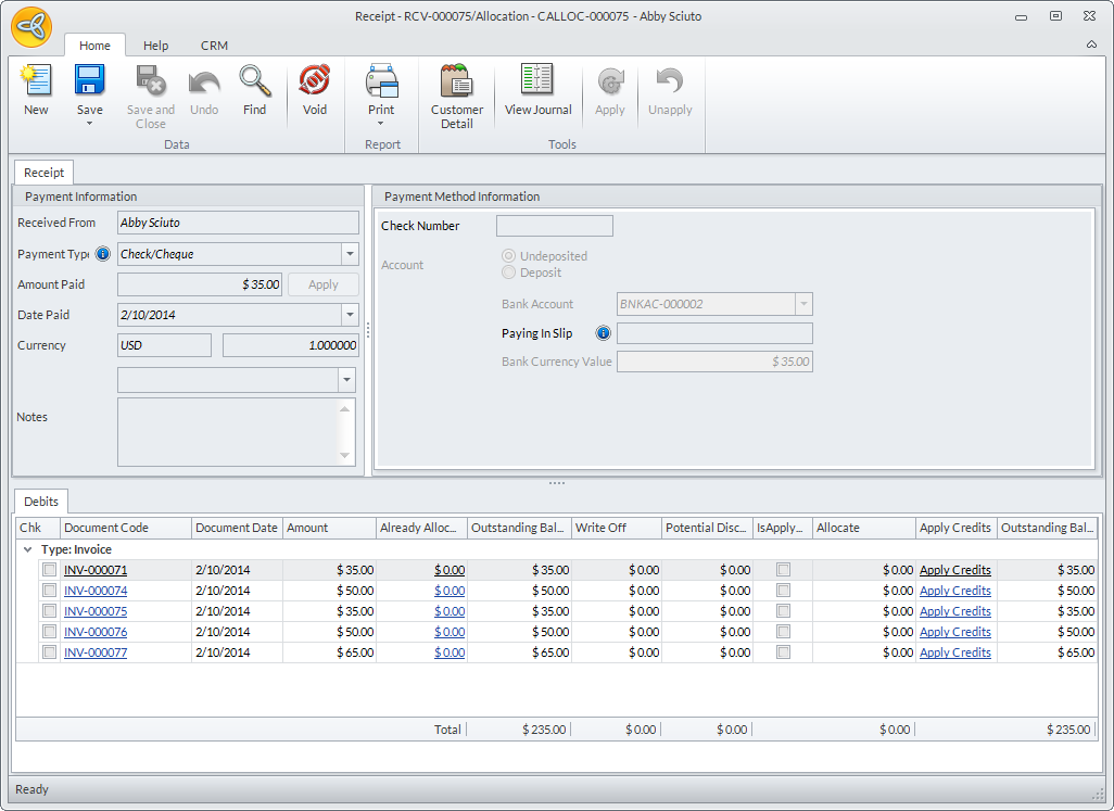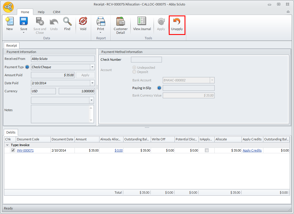 You can also reallocate the payment or change the payment allocation from one invoice to another. Upon clicking the Unapply button, the list of unallocated invoices will be displayed in the Debits section. Select the invoice where the payment will be allocated, click Apply then click Save or Save and Close.
