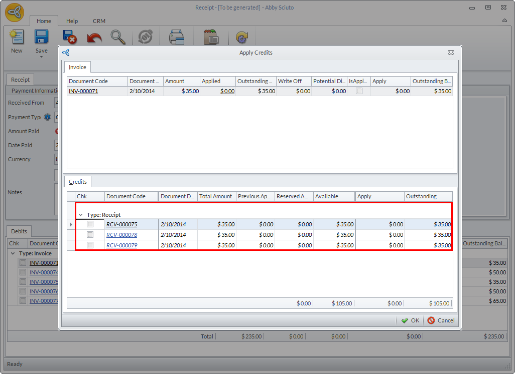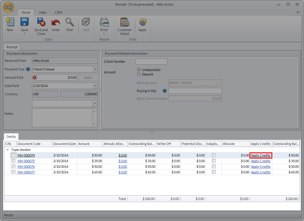 You can also view the list of all unallocated customer receipts from the Apply Credits form when applying credits against the customer’s existing invoices. See Apply Customer Payments As Credits.