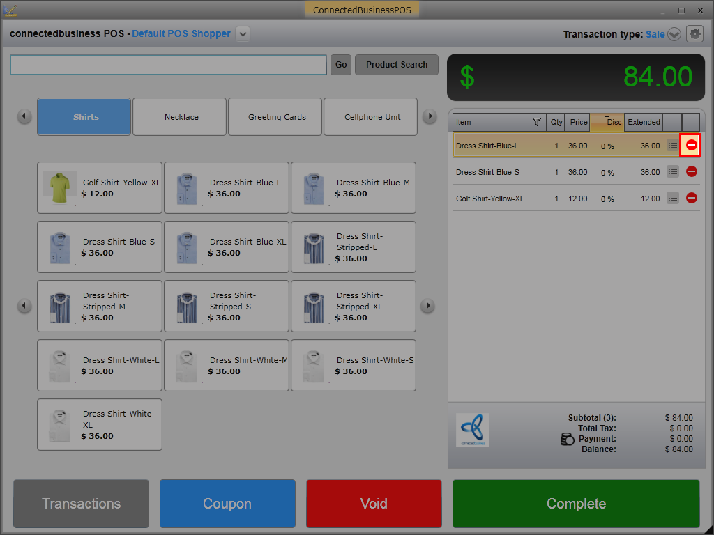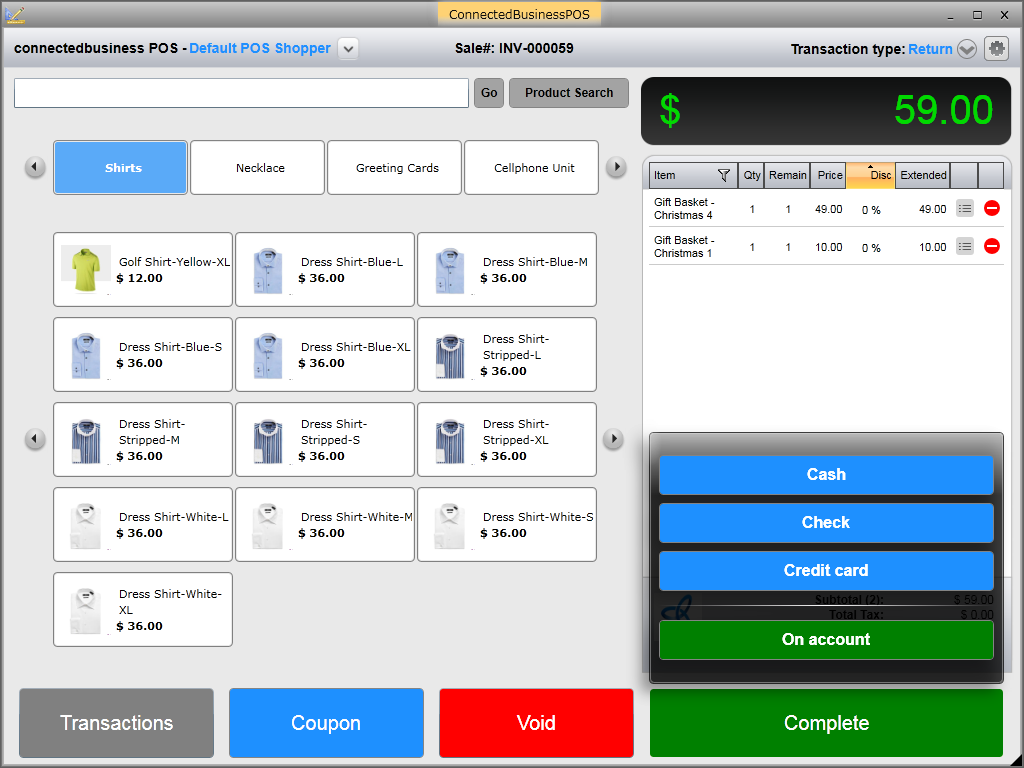 - Select the transaction type (Sale, Order, Quote, Return) and enter items for checkout.
