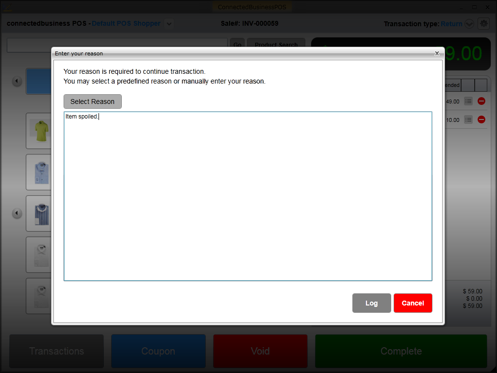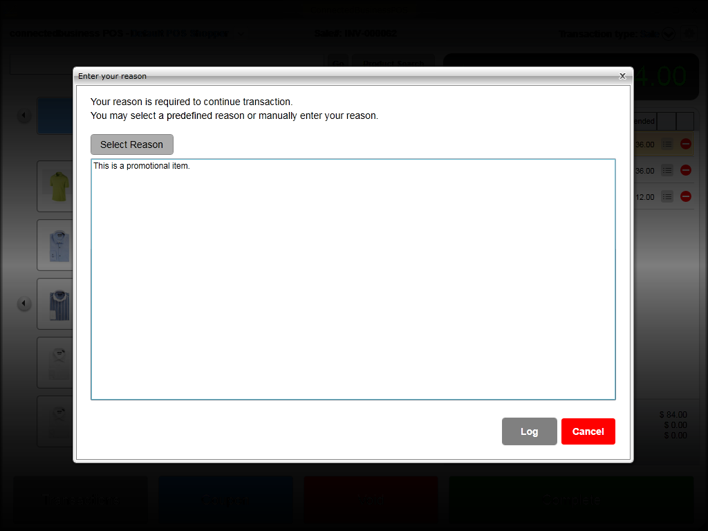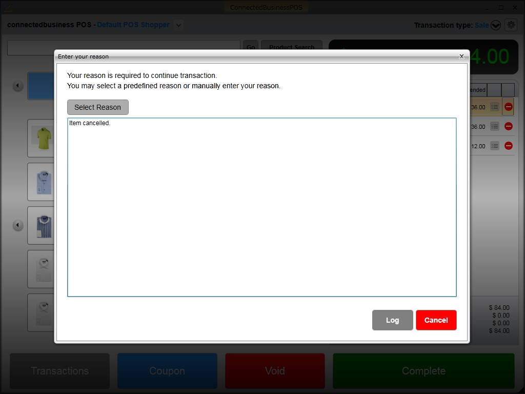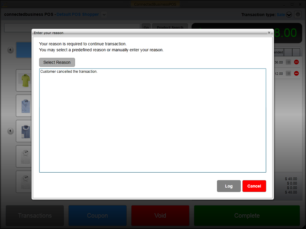 - The Enter your reason window will be displayed. You can manually enter the reason for voiding the transaction or click the Select Reason button if you have predefined reason codes set up in Connected Business. Click Log to save reason details.