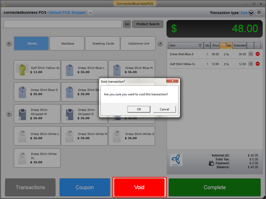 - Click the Void button. A Void Transaction pop-up window will be displayed confirming if you want to void the transaction or not. Click OK.
