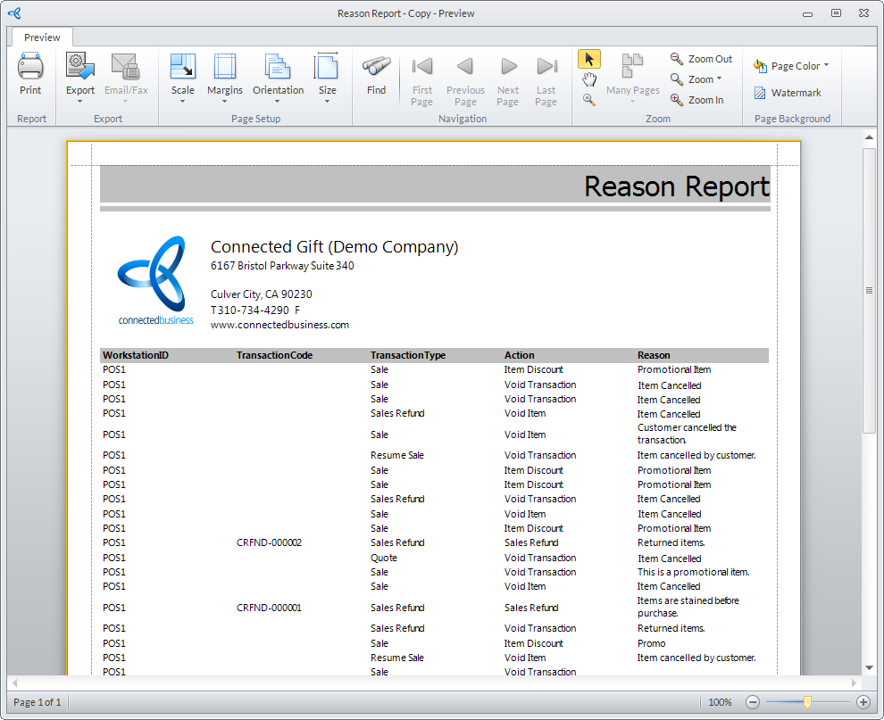 To view the reason log history, go to the Report Center of any module in Connected Business. From the Report Center, click Reports > System Reports > POS > General > Reason Report.