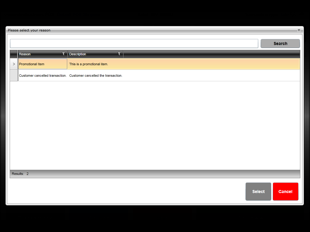 - Select the reason for the transaction and click Select. The reason will be automatically loaded in the Enter your reason window.