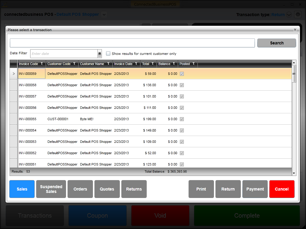 - Set the transaction type to Returns. The list of active invoices will be displayed.