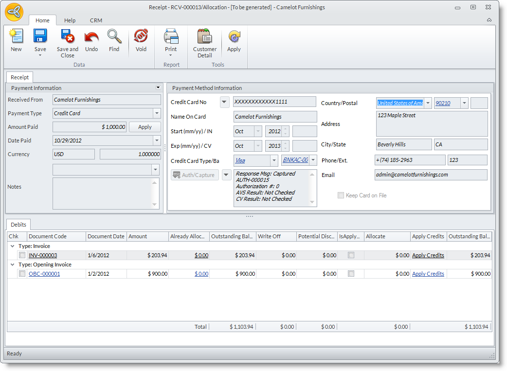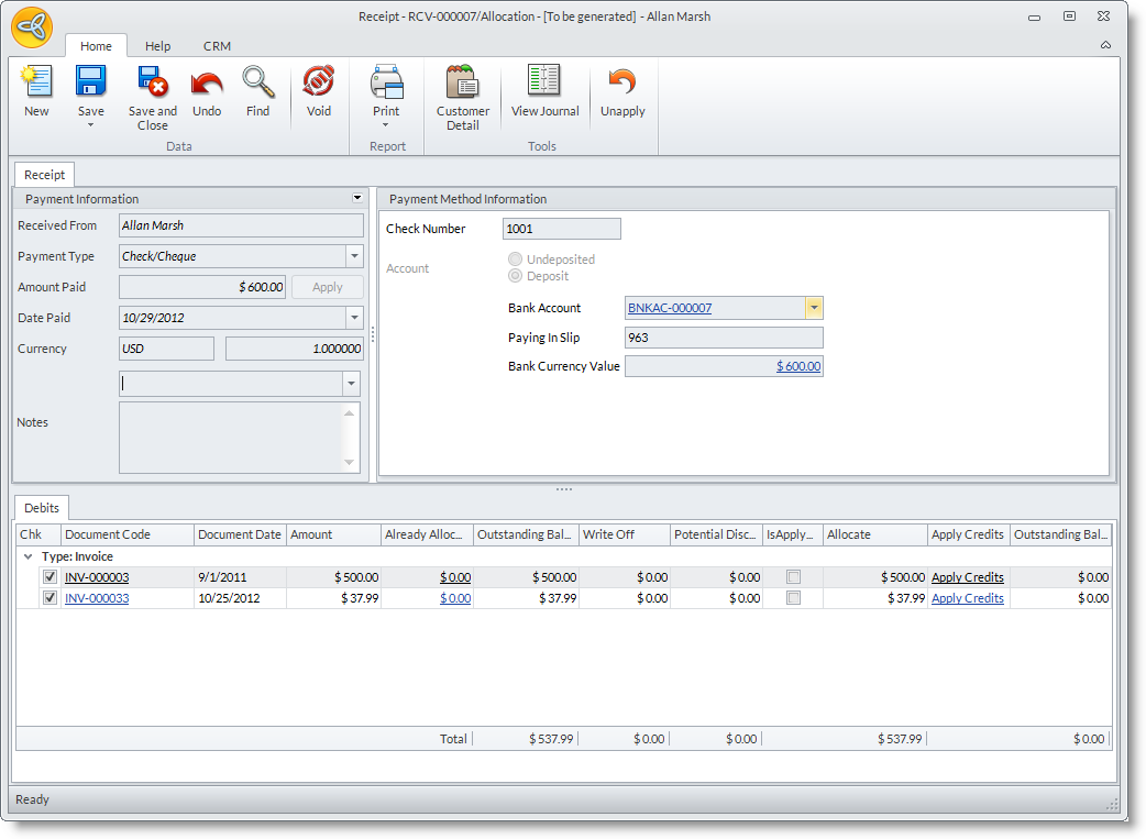 Customer Receipts is the document of payment for the invoice of ordered items that was shipped to the customer. Interprise Suite gives you the options to accept the different methods of customer payment, check, credit card, cash and others. Cash and Check payments can be directly deposited or kept on hand for later until ready to deposit.