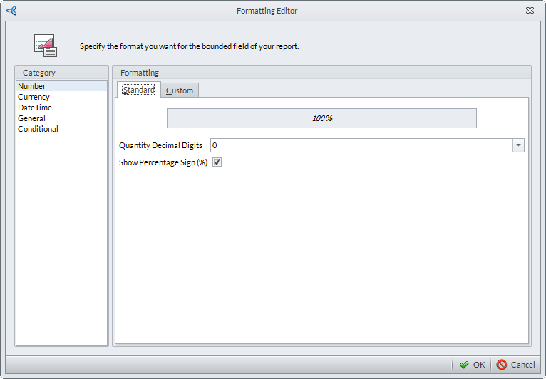- On the Formatting Editor window, click on Number tab. The Standard and Custom tabs will display.