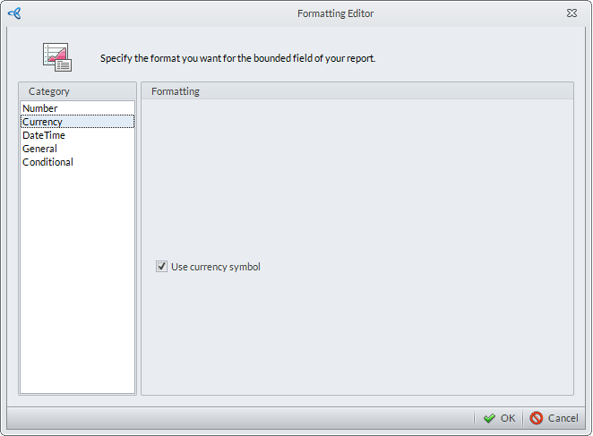 - On the Formatting Editor window, click on Currency tab. The Formatting section will display.