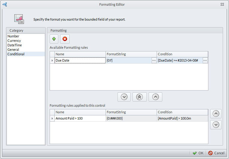 - On the Formatting Editor window, click on Conditional tab. The Formatting section will display.