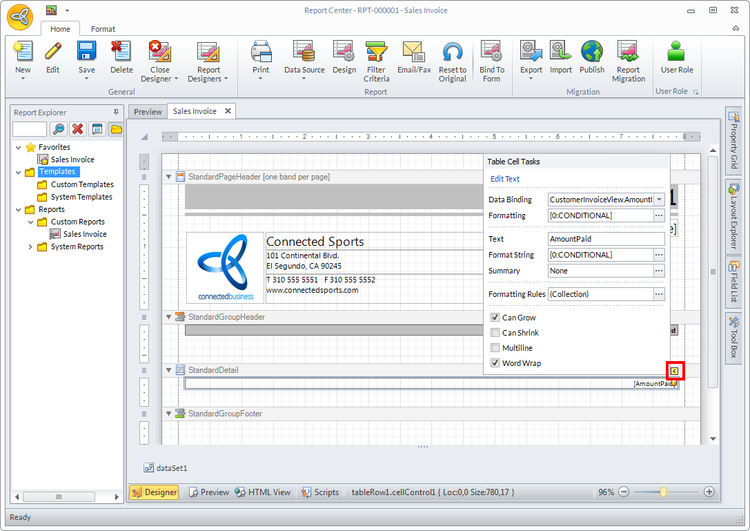 You can format the data fields in your report depending on your required business needs. To format data fields, you can access the formatting editor by clicking the Design button from the options. Click the Fields tab, select the available fields tab and click Apply Formatting. The Formatting Editor window will display.