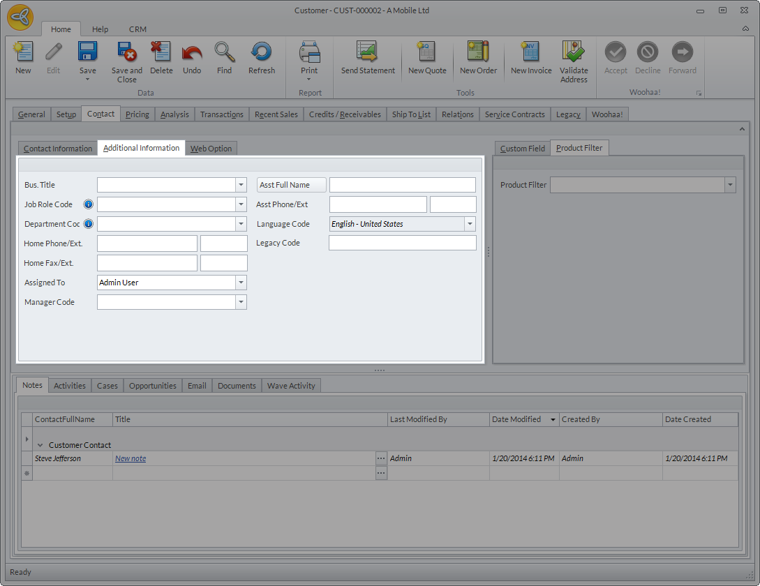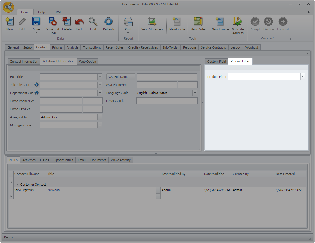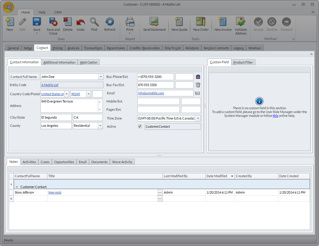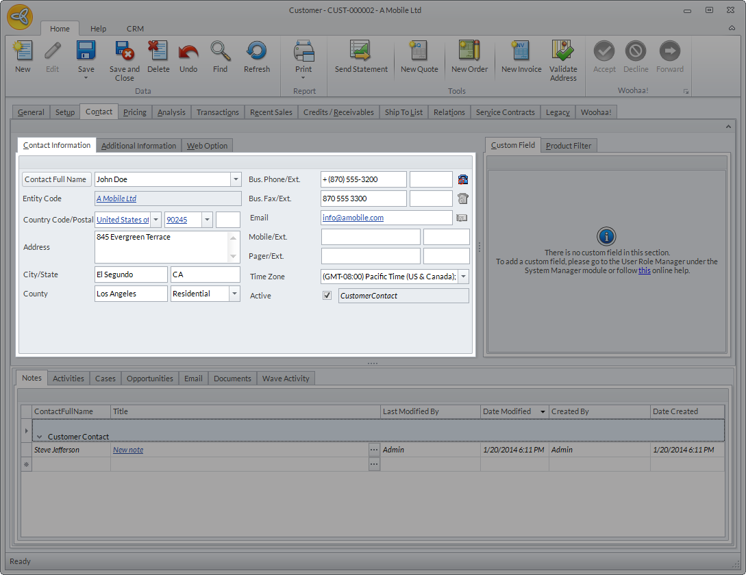 The Contact Information section shows the contact’s general information. If the customer has multiple contacts, click on the dropdown list of the Contact Full Name field, then select the contact to view the contact details. If you want to add a new Contact, click the CRM tab then select New Contact. Enter the contact details as needed then click Save or Save and Close.