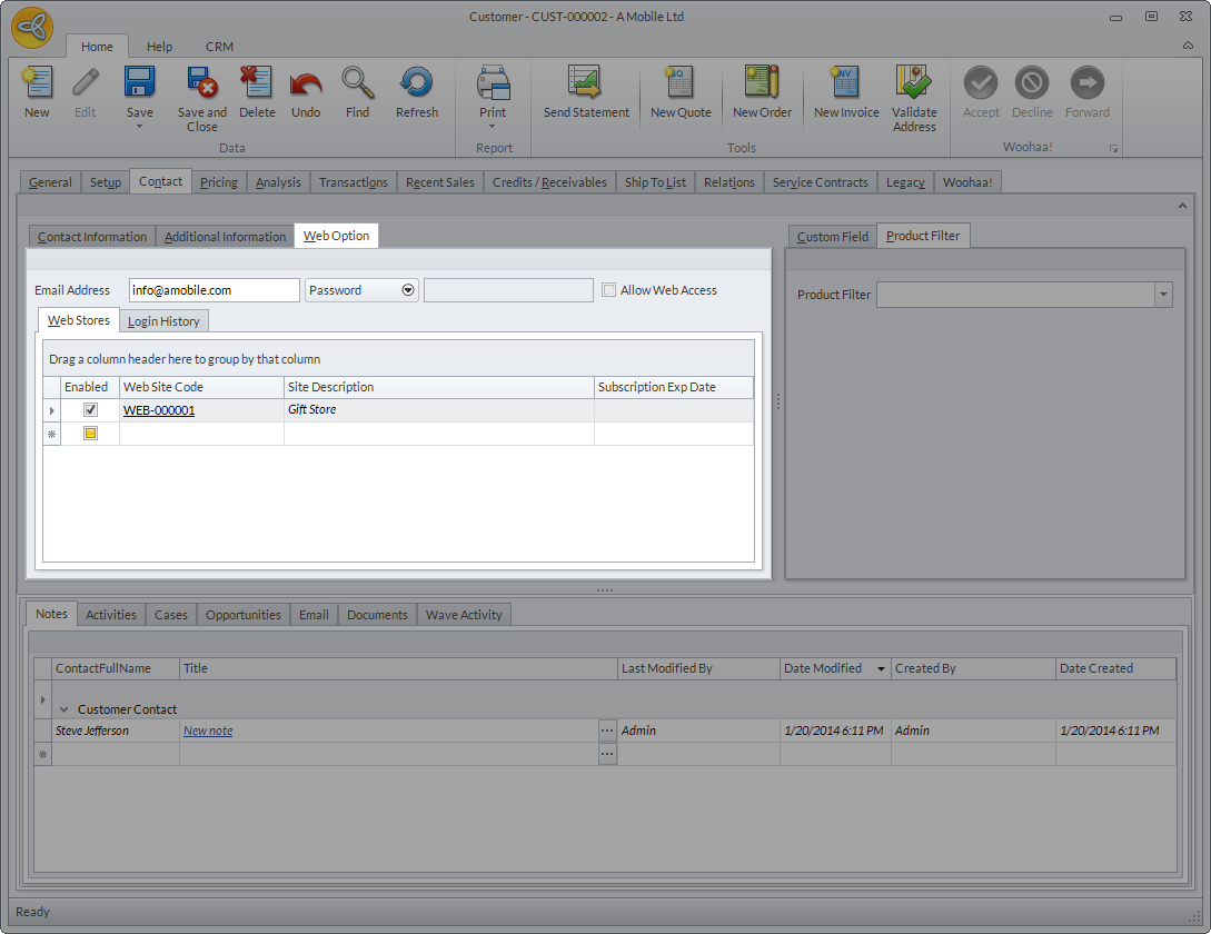 The Web Option tab shows the contacts email address and web login history. This is where you can update the contact’s email address and password as well as manage the contact’s access to the webstore.
