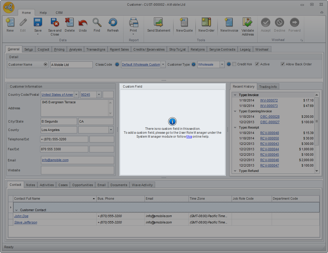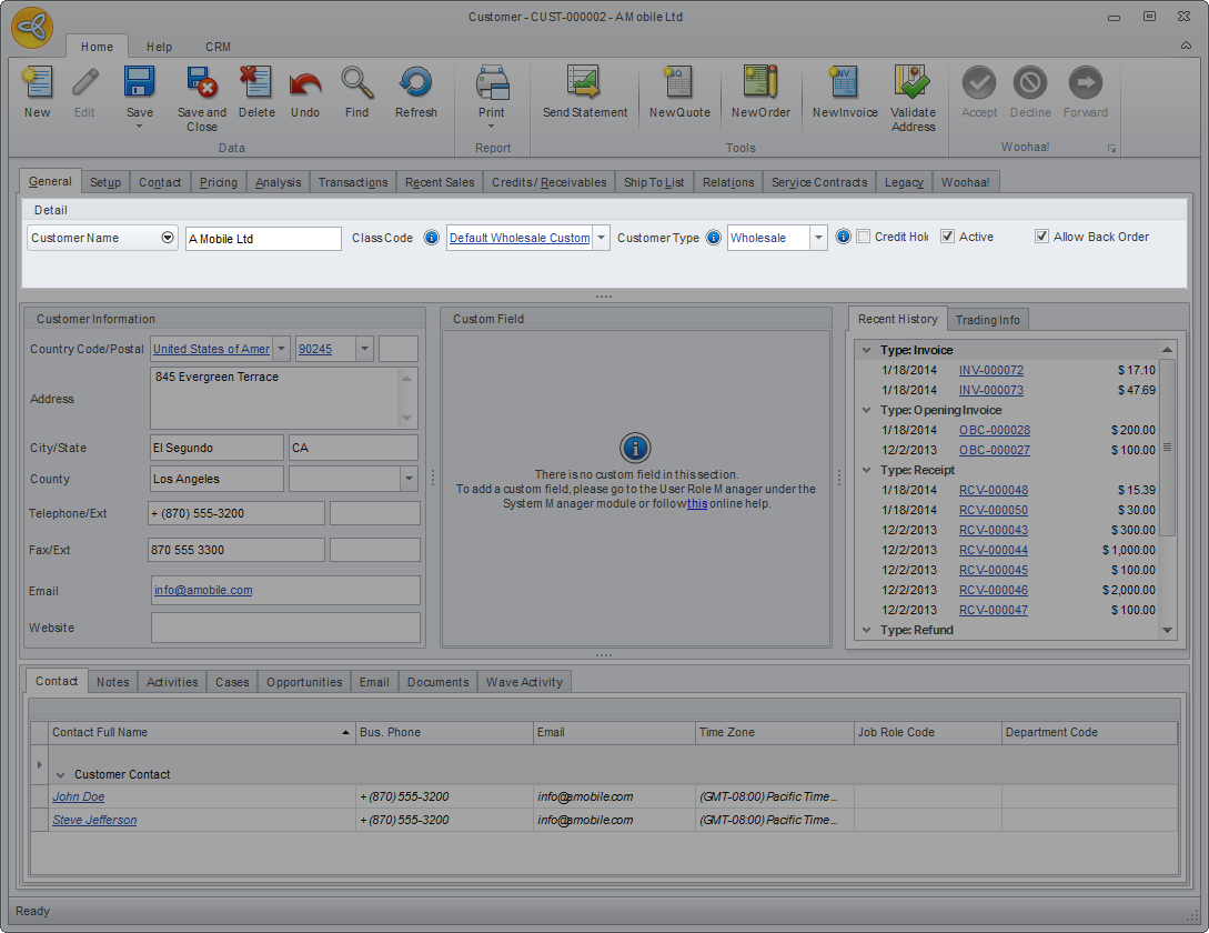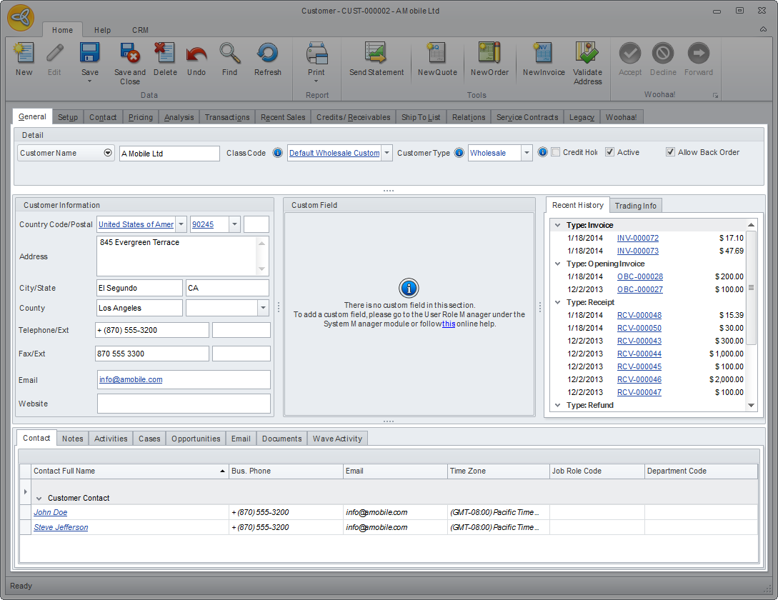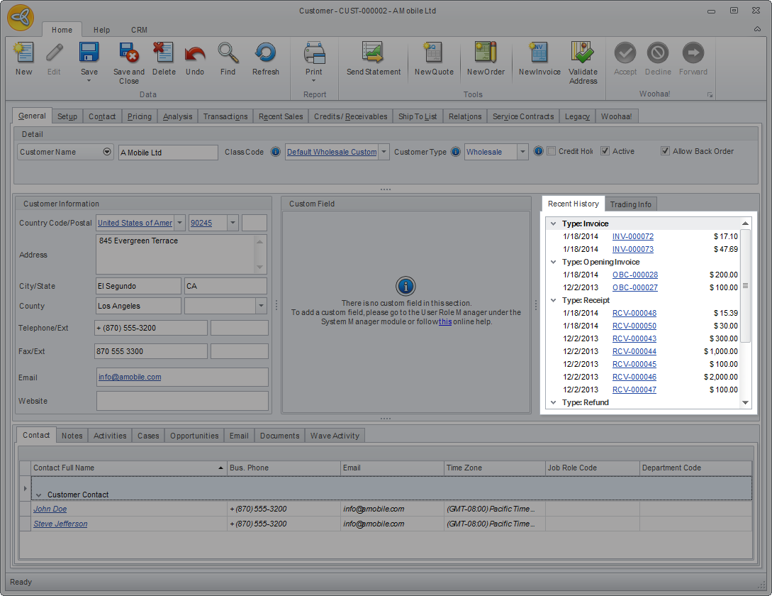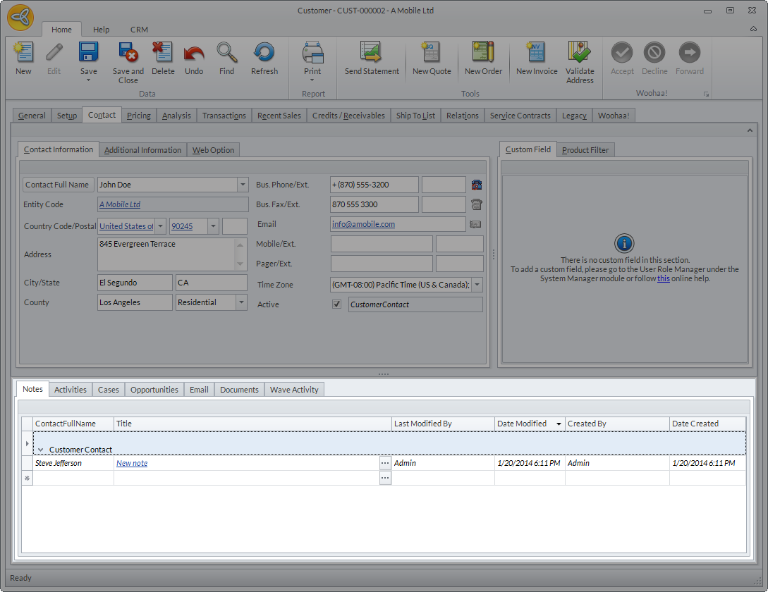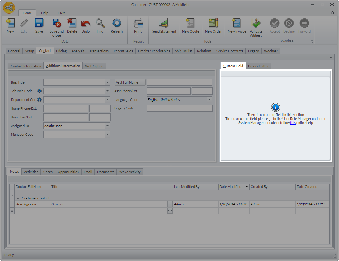 The Custom Field tab shows the custom fields added (if there is any) for customer contact use.