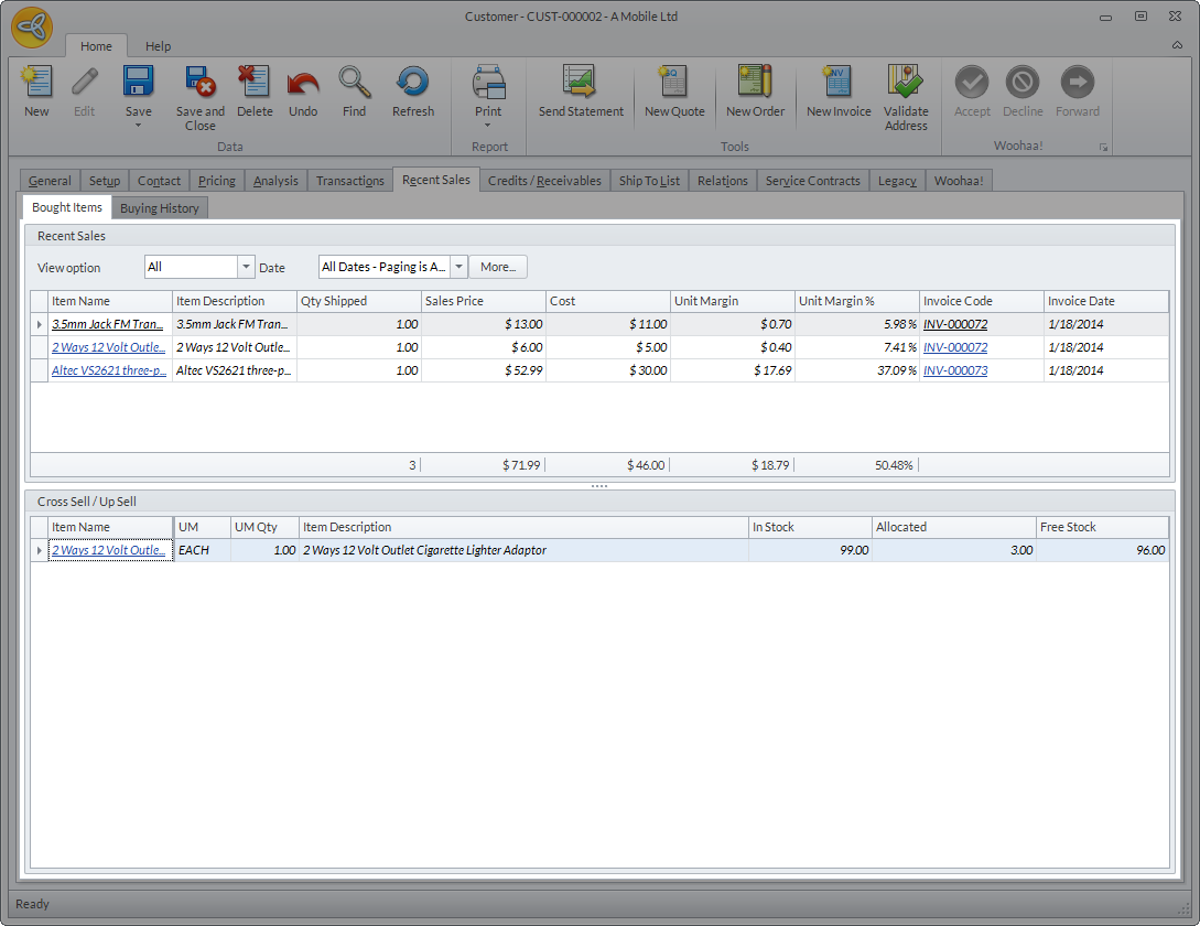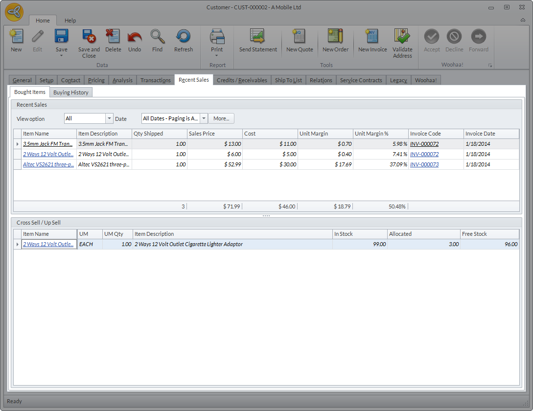 The Recent Sales tab shows the customer's bought items and buying history. It also shows the items that are set for cross sell or upsell.