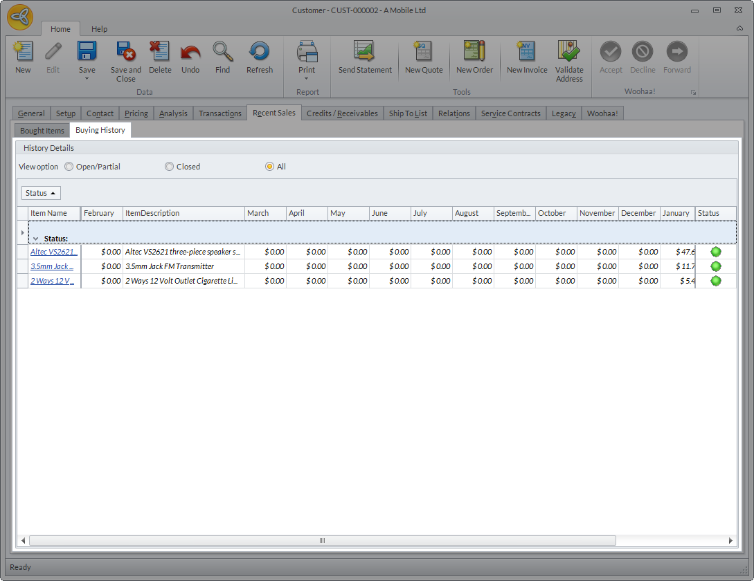 The Buying History tab shows the items bought by the customer and the breakdown of the sales amount by month and the totals. The records can be filtered by status (Open, Closed or All).