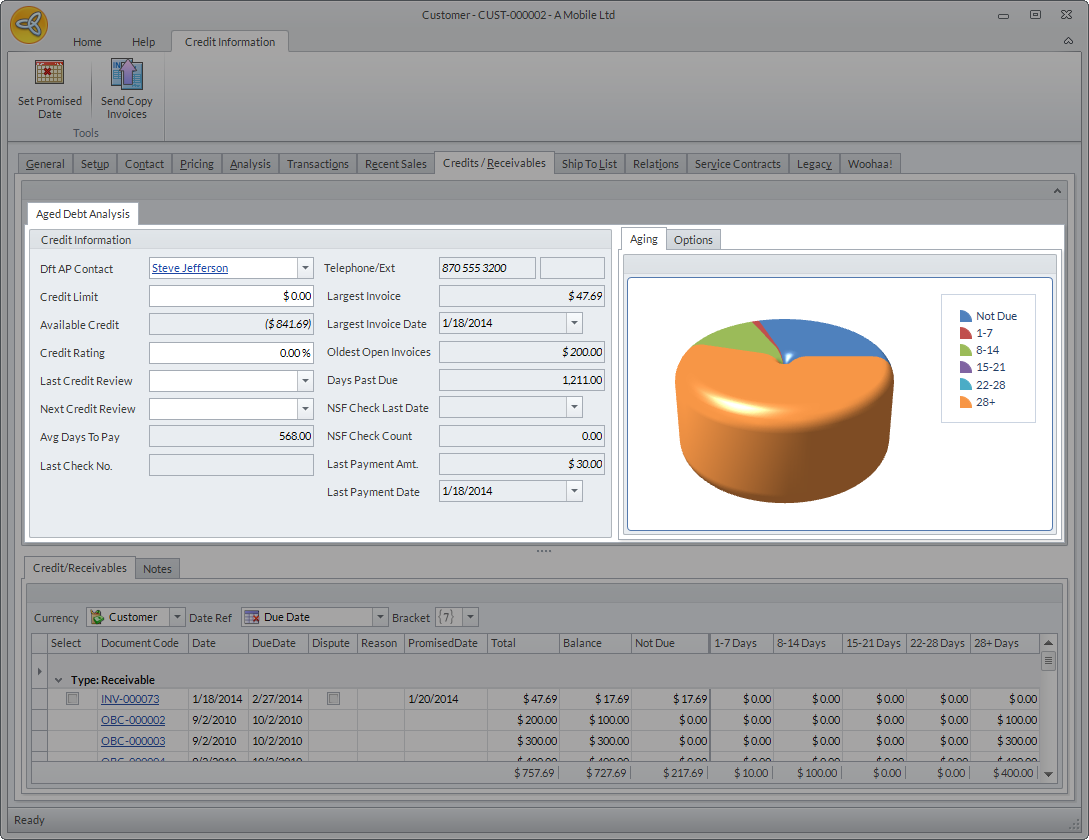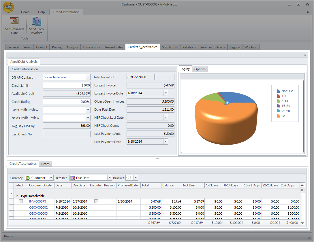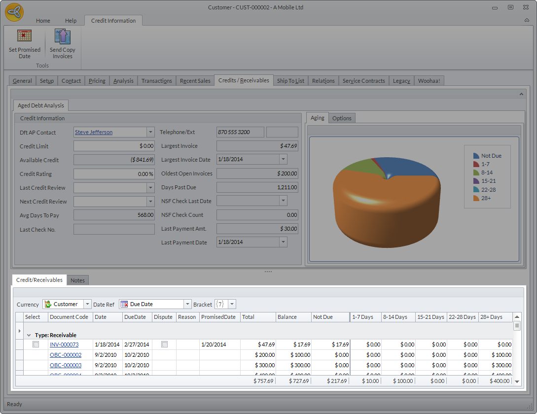 The Credit/Receivables tab shows the overall credit standing of the customer. From this tab, you can see the customer's credit information, the outstanding credits and receivable, as well as the days due.