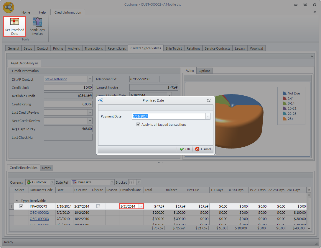 You can also define the days of overdue displayed in the list by setting the days overdue range from the Bracket dropdown list. The ranges are: 7, 14, 28, 30.To set promised dates for customer payments, select the invoice to be paid and click the Set Promised Date button. The Promised Date dialog box will be displayed. Enter the promised date of the customer to pay the invoice and click OK. The date will be indicated in the Promised Date column.