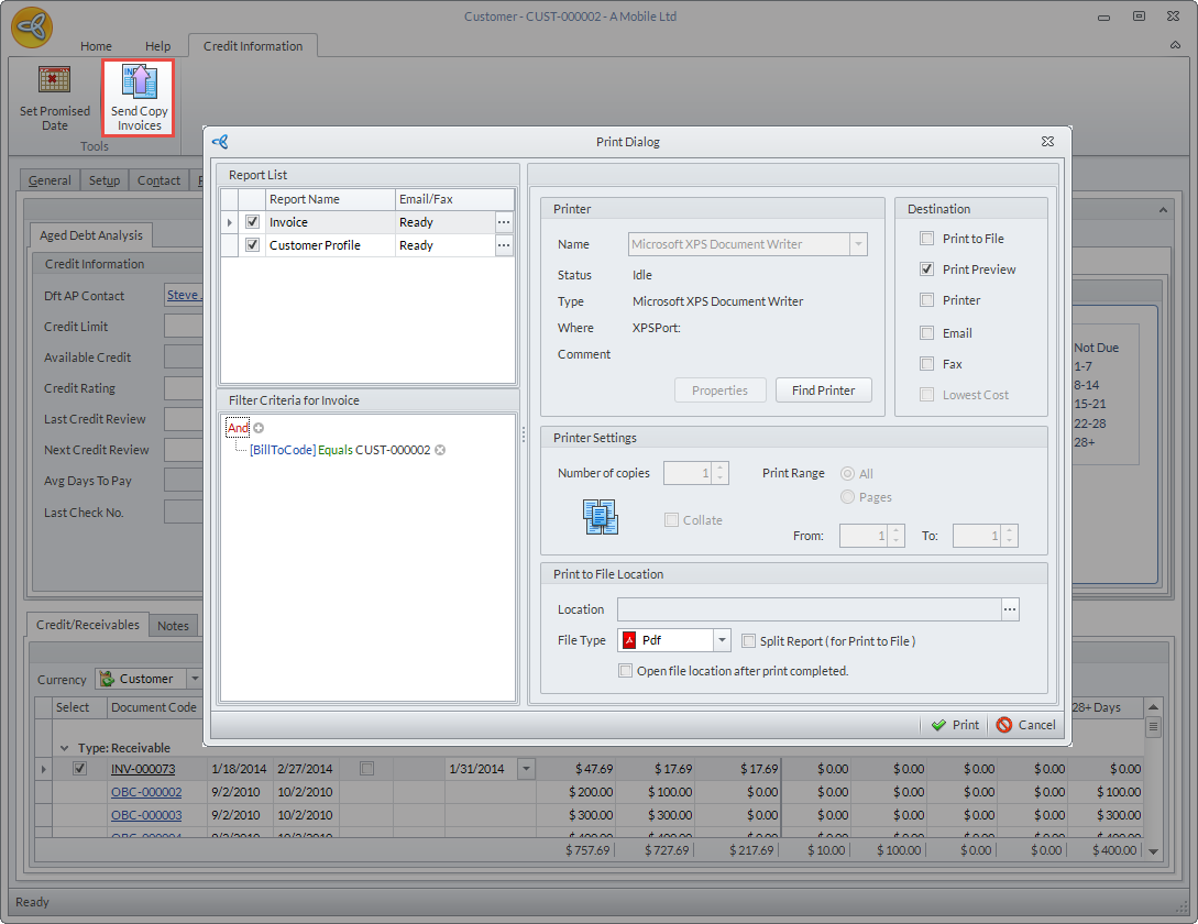 You can also send copy of invoices to customer. Tick the checkbox the invoice/s to be sent and click the Send Copy Invoices button. Select how you want to send the invoice from the Print Dialog form and click OK.