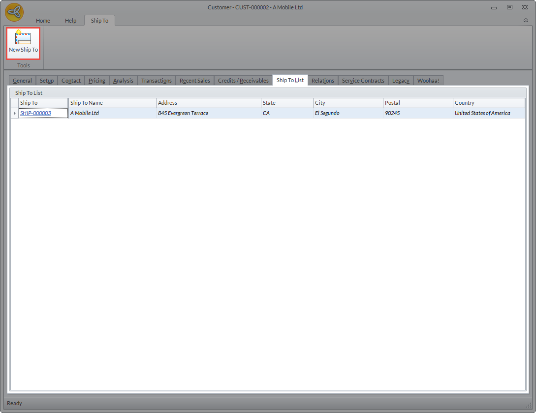 The Ship To tab shows the list of the customer’s ship to contact. You can view the Ship To detail by clicking the Ship To code or click the New Ship To button to create a new ship to contact. You can also refer to Manage Customer Shipping Information for more details.