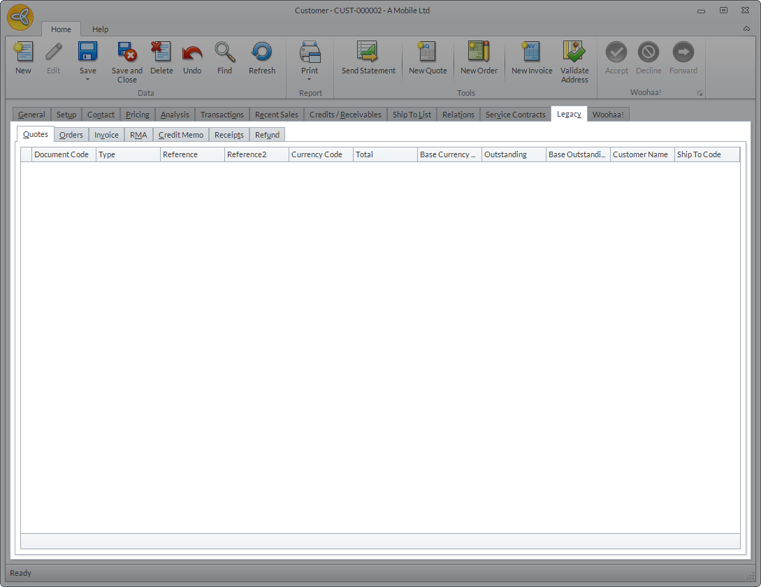 The Legacy tab shows all of the customer transactions as recorded in the user’s previous database (if there is any).