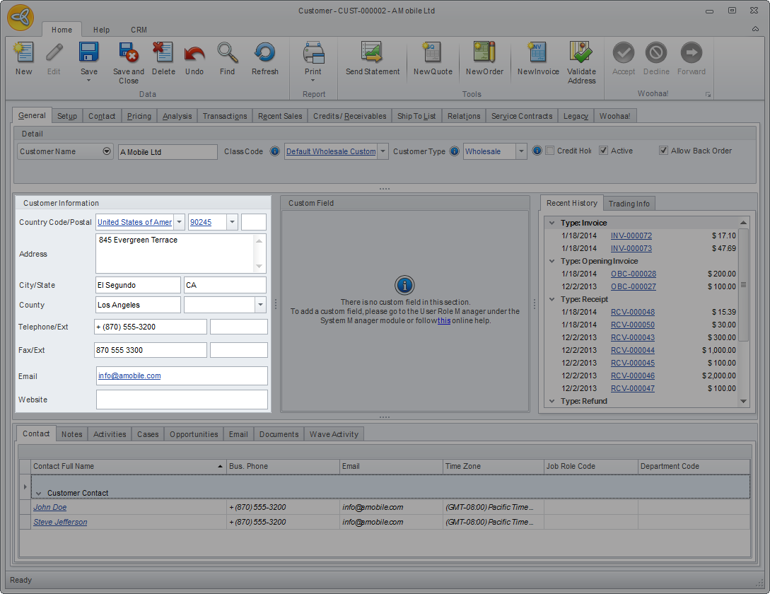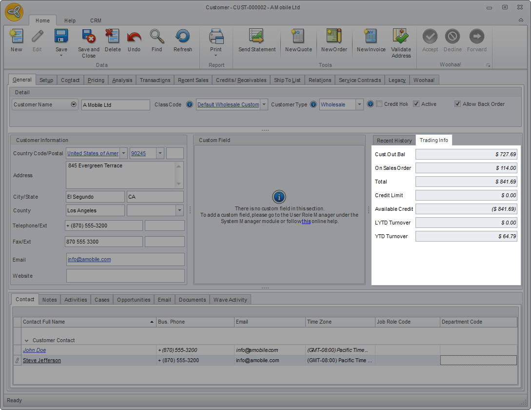 The Customer Information section shows the billing address and primary contact numbers of the customer, as well as the customers email address and website.