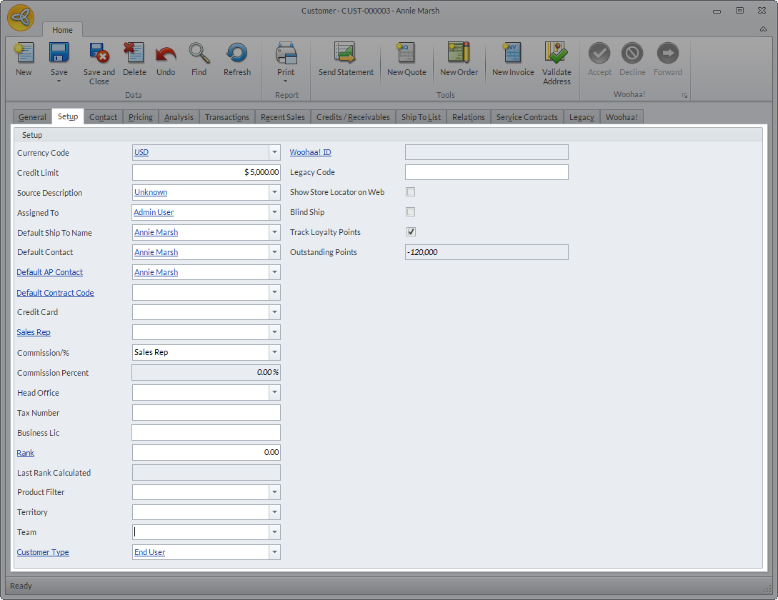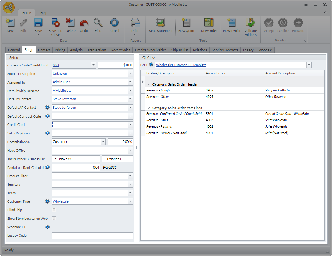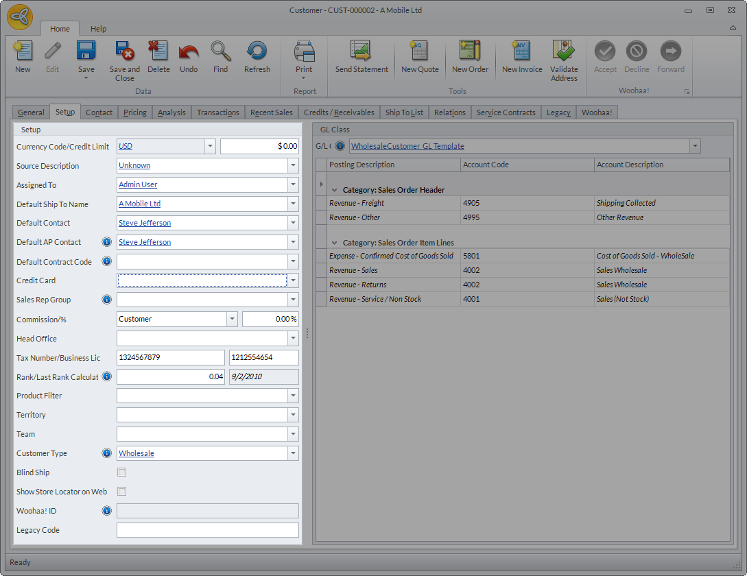 The Setup tab shows various account-related information provided upon creating the customer record as well as the posting accounts.