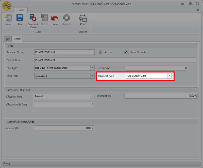 Create a new set of Payment Terms to be associated with your POS workstations. Go to Banking > Setup > Payment > Payment Terms to load the form. Click the New button.