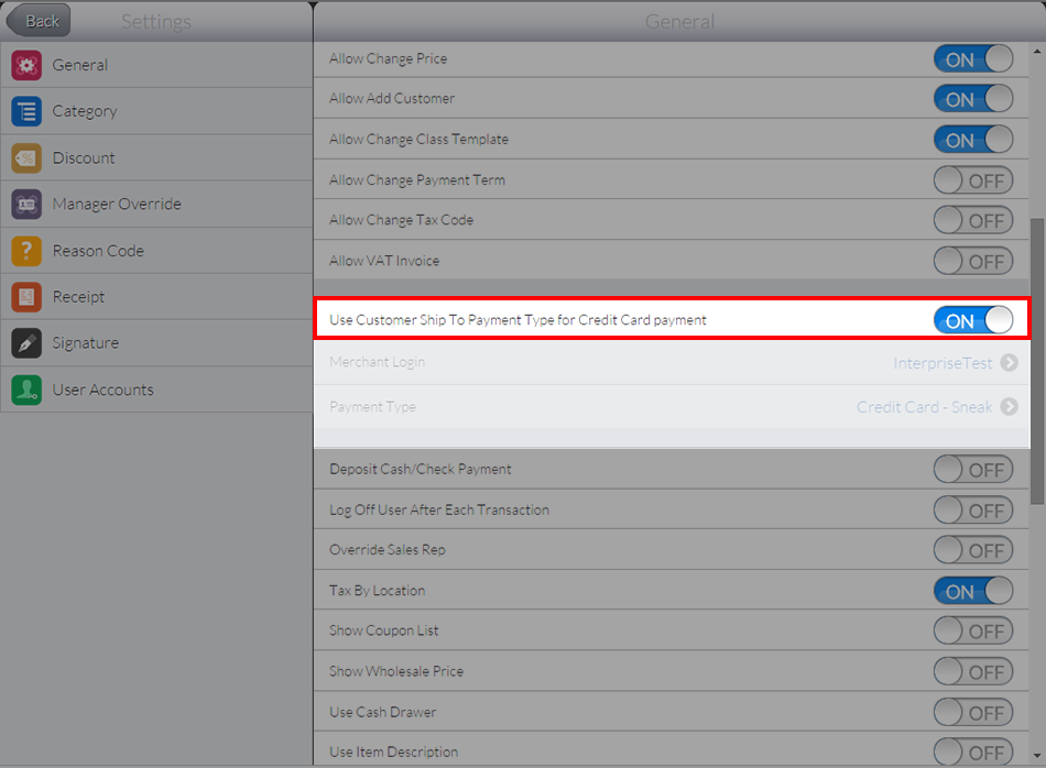 Setting up your workstations to exclusively process a single merchant account means that you are disabling the POS setting which uses your customers' ShipTo Payment Type for credit card processing. This setting is disabled using the Settings screen in the POS interface.