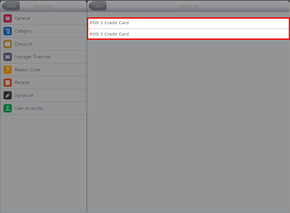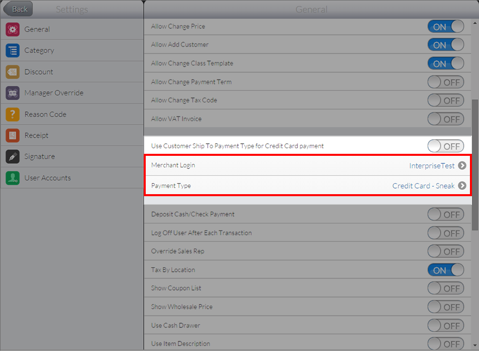 Back on the Settings interface, tap on Payment Type to choose from one of the payment types associated with the merchant login. Tap the Back button to save your changes.