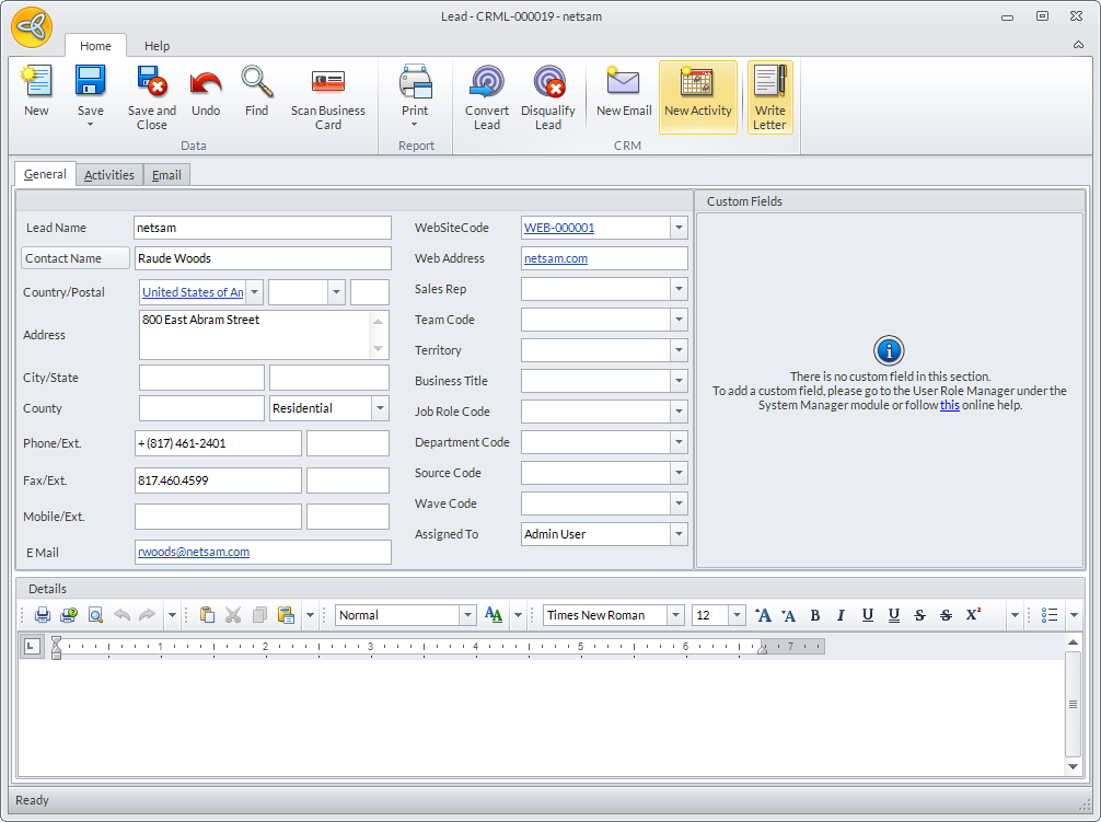 - The system will generate the scanned details to a new lead. The lead form will display.