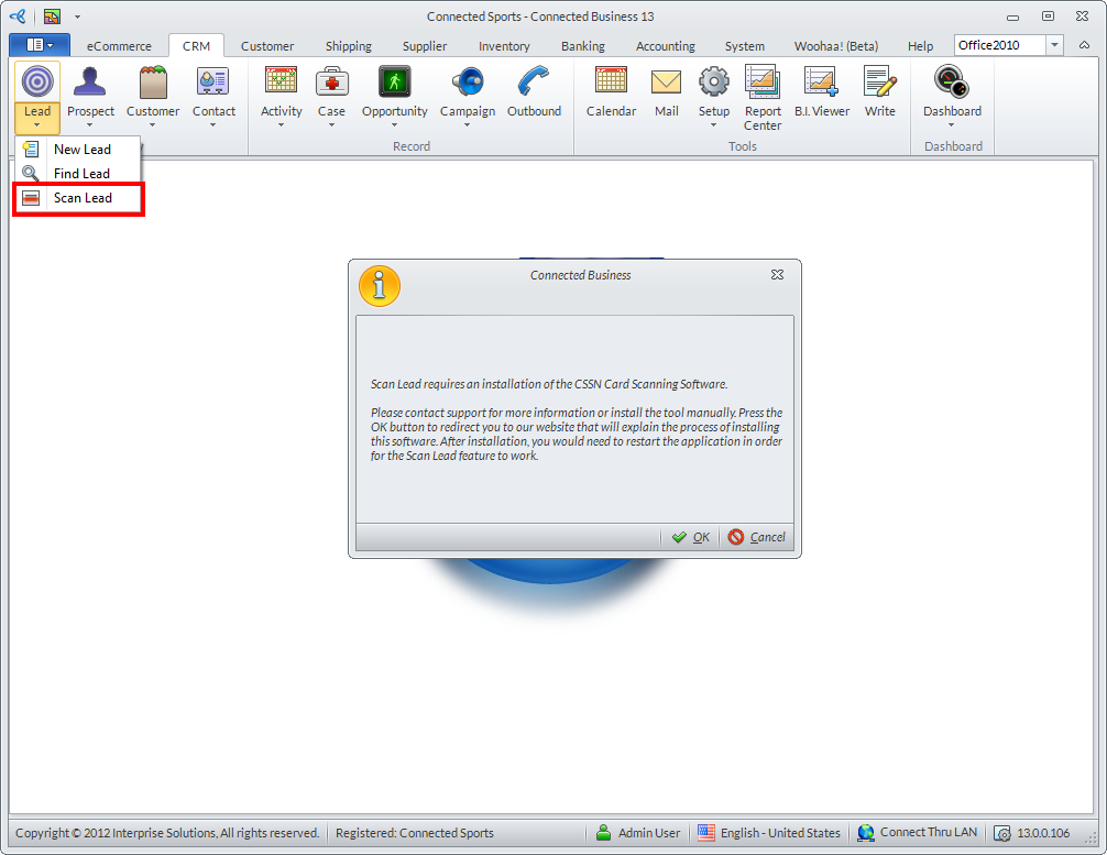 The CSSN SDK is installed separately from Connected Business The scan lead option found in the CRM module can be best used if the CSSN SDK installer is properly installed. Clicking on the Scan Lead button will display a form informing you to install the CSSN installer. Click OK then it will redirect you to the documentation guide on how to properly install the Card Scanning option.