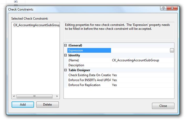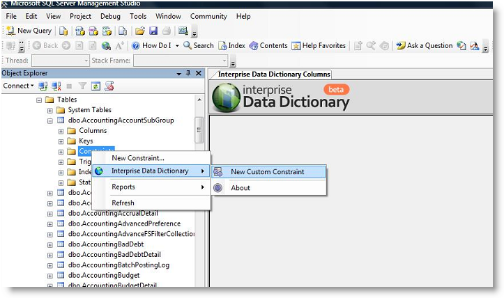 - Right Click on Constraint Folder > Interprise Data Dictionary > New Custom Constraint. The new custom constraint window will load.