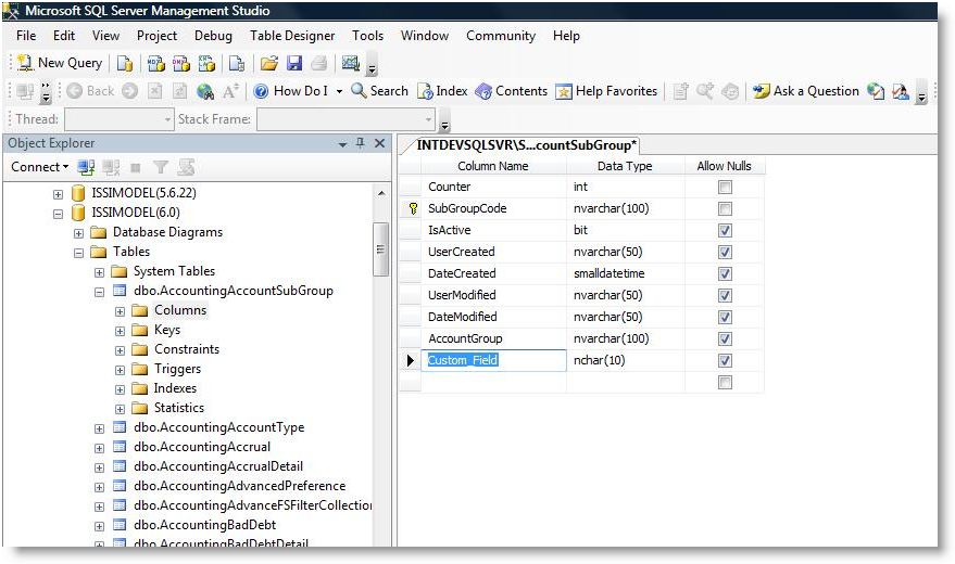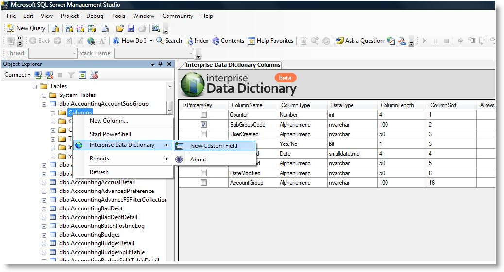- Right Click on Column > Interprise Data Dictionary > New Custom Field. The Table designer will load.