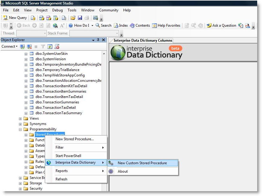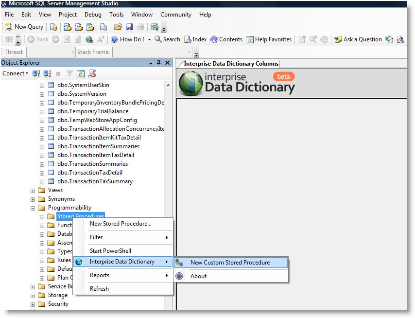 - Right Click on Stored Procedure > Interprise Data Dictionary > New Stored Procedure. The new custom script procedure will load.