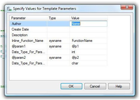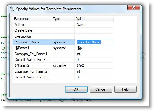 - Enter the name for the new stored procedure in the template parameter box or you can enter the name directly in the script.