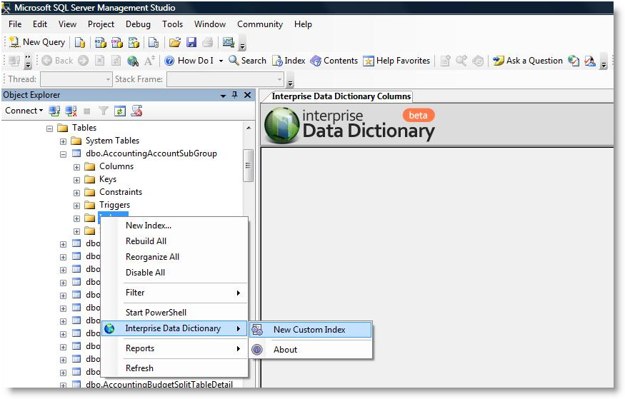 - Right Click on Indexes Folder > Interprise Data Dictionary > New Custom Index. The new custom index script will load.