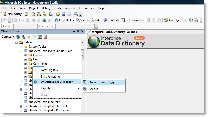 - Right Click on Triggers > Interprise Data Dictionary > New Custom Triggers. The new custom trigger script will load.