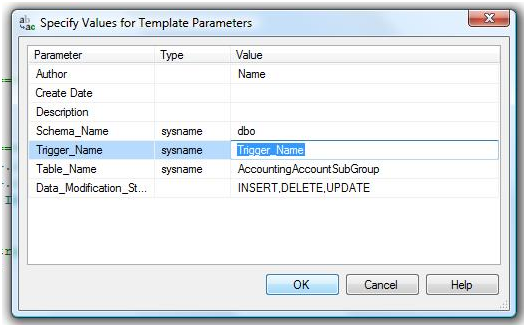- Enter the trigger name and table name in the template parameter box or you can enter the name directly in the script.