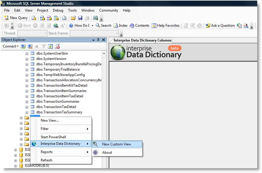 - Right Click on View > Interprise Data Dictionary > New Custom View. The view designer will load.