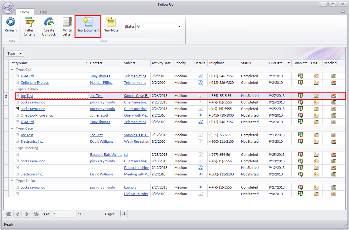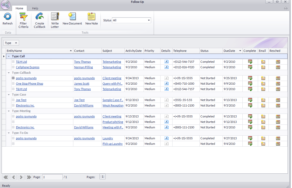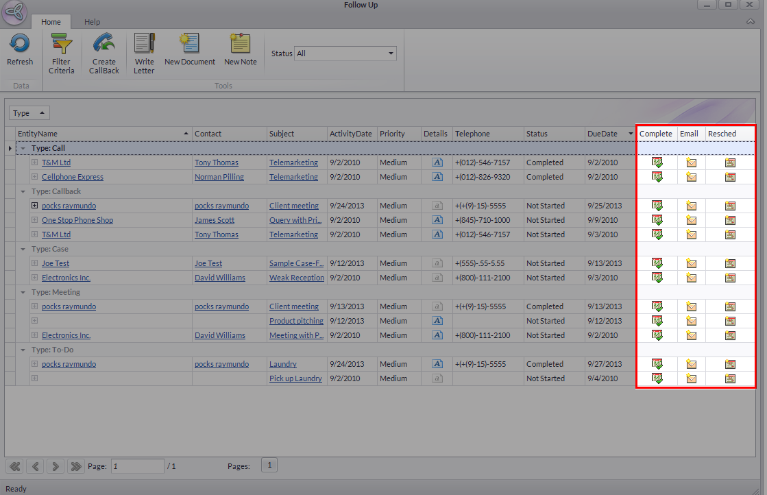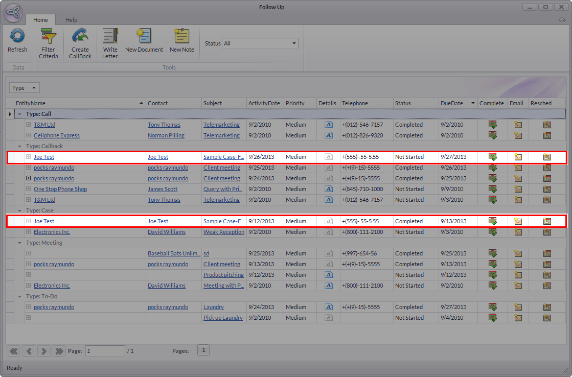 - Click OK then Refresh the Follow Up form to apply changes. Notice that the status of the activity has been changed to “Completed”, as it has been duplicated and assigned as “Not Started" in the Callback section of the list.