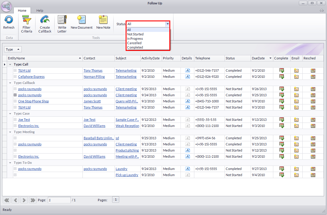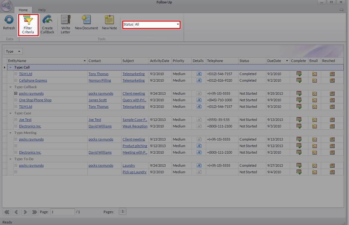 In sorting the list of activities in the Follow Up Form, you can either use the Filter Criteria or the Status Field option.