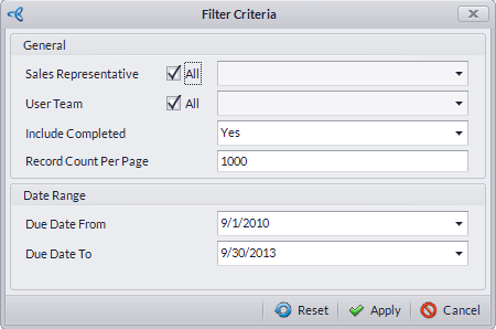 The “All” radio buttons in the General area are marked with check by default. This allows the Filter Criteria to include the entire lists of Sales Representative and User Team on the filter results. Uncheck the buttons to assign the specific Sales Representative and User Team.