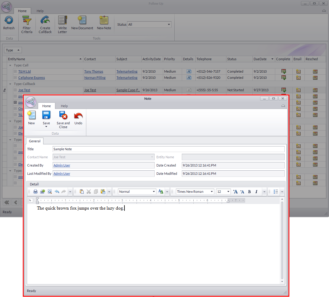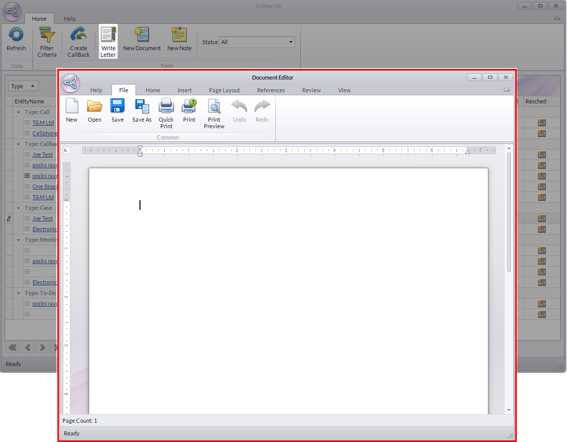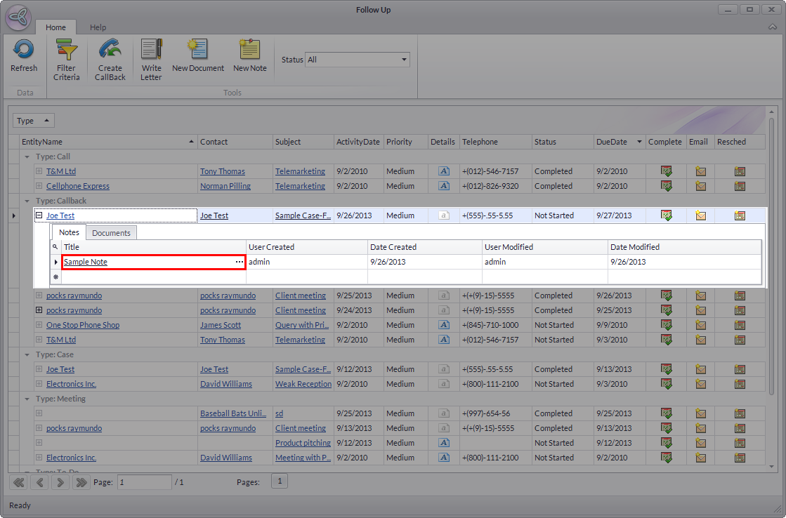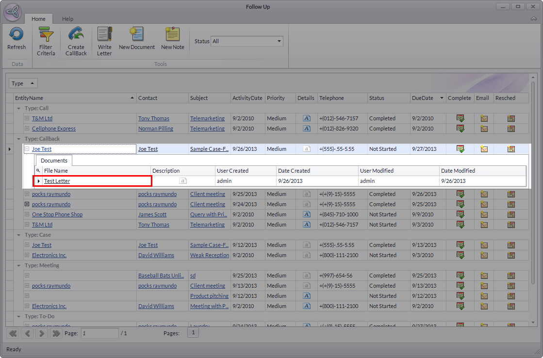The Follow Up form is designed not just for viewing existing activities on the database. It is also fitted with dedicated menus to perform follow up tasks such as creating callbacks, writing business letters and/or memos, attaching documents and creating notes.
