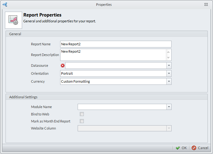 Clicking this opens the Report Properties form. It is here you can set the general and additional properties of the report.