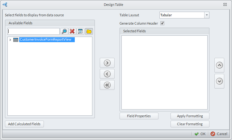 - Table - Clicking this opens the Design Table form. Here, the user can select which from the available fields to be displayed and the appearance of the table layout.