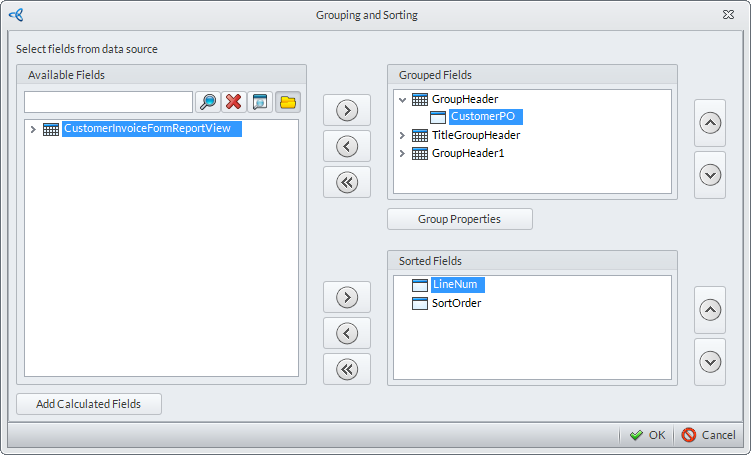 Clicking this opens the Grouping and Sorting form. This allows the user to select data fields from the available list and group them into standard group headers. See Create a new report from scratch for more information.