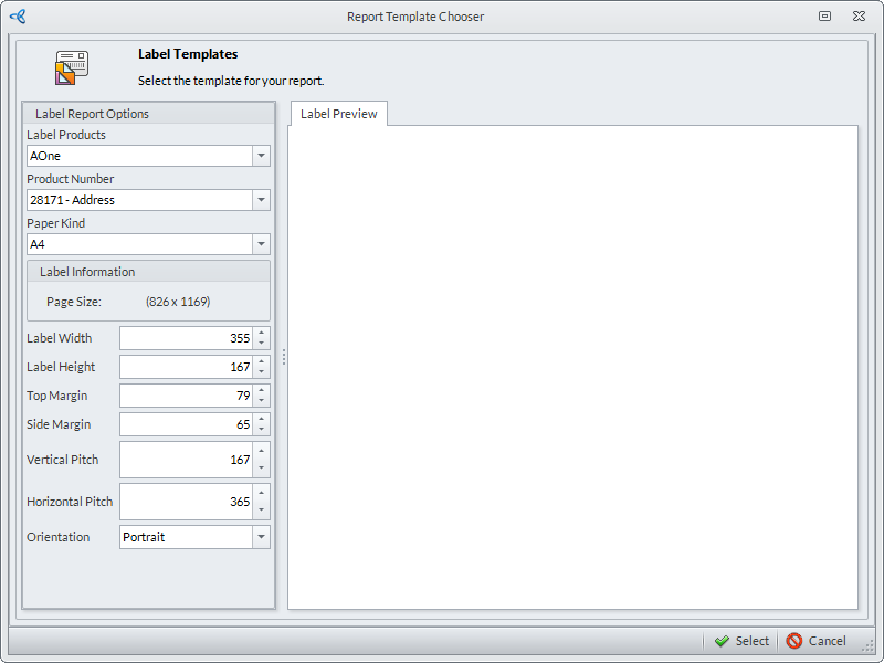 This will open the Report Template Chooser form. From here the Label Report Options can be set. Click Select to accept and apply the settings.